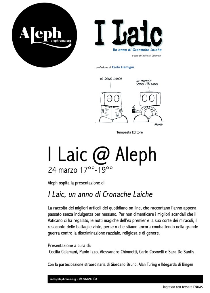 marzo 19, 2012luglio 31, 2012 by Sara De Santis Presentazione I LAIC @ Aleph Attrice, Autrice, Cantante 24 marzo 2012 Presentazione di I LAIC il libro di Cronache Laiche con interventi artistici a cura di Carlo Cosmelli, Sara De Santis, Paolo Izzo Special guest: Giordano Bruno – Alain Turing – Ildegarda di Bingen Per saperne di più raggiungici presso Aleph ore 17 in via Savona 13a – Roma *Per chi vuole trattenersi, segue serata aperitivo Condividi: Fai clic per condividere su Facebook (Si apre in una nuova finestra) Facebook Fai clic per condividere su X (Si apre in una nuova finestra) X Fai clic qui per condividere su Tumblr (Si apre in una nuova finestra) Tumblr Fai clic qui per condividere su Pinterest (Si apre in una nuova finestra) Pinterest Fai clic qui per condividere su LinkedIn (Si apre in una nuova finestra) LinkedIn Fai clic qui per stampare (Si apre in una nuova finestra) Stampa Fai clic per inviare un link a un amico via e-mail (Si apre in una nuova finestra) E-mail Mi piace Caricamento... Correlati
